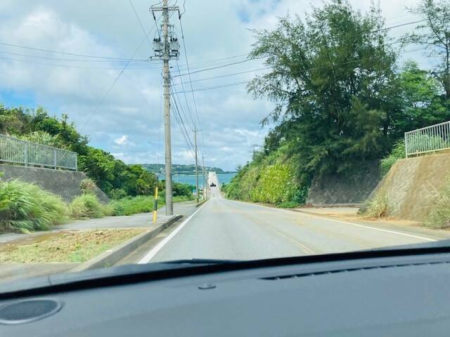 ほら! この先に見えるのわかります? 古宇利大橋ですよ。両側は海~あたりまえw