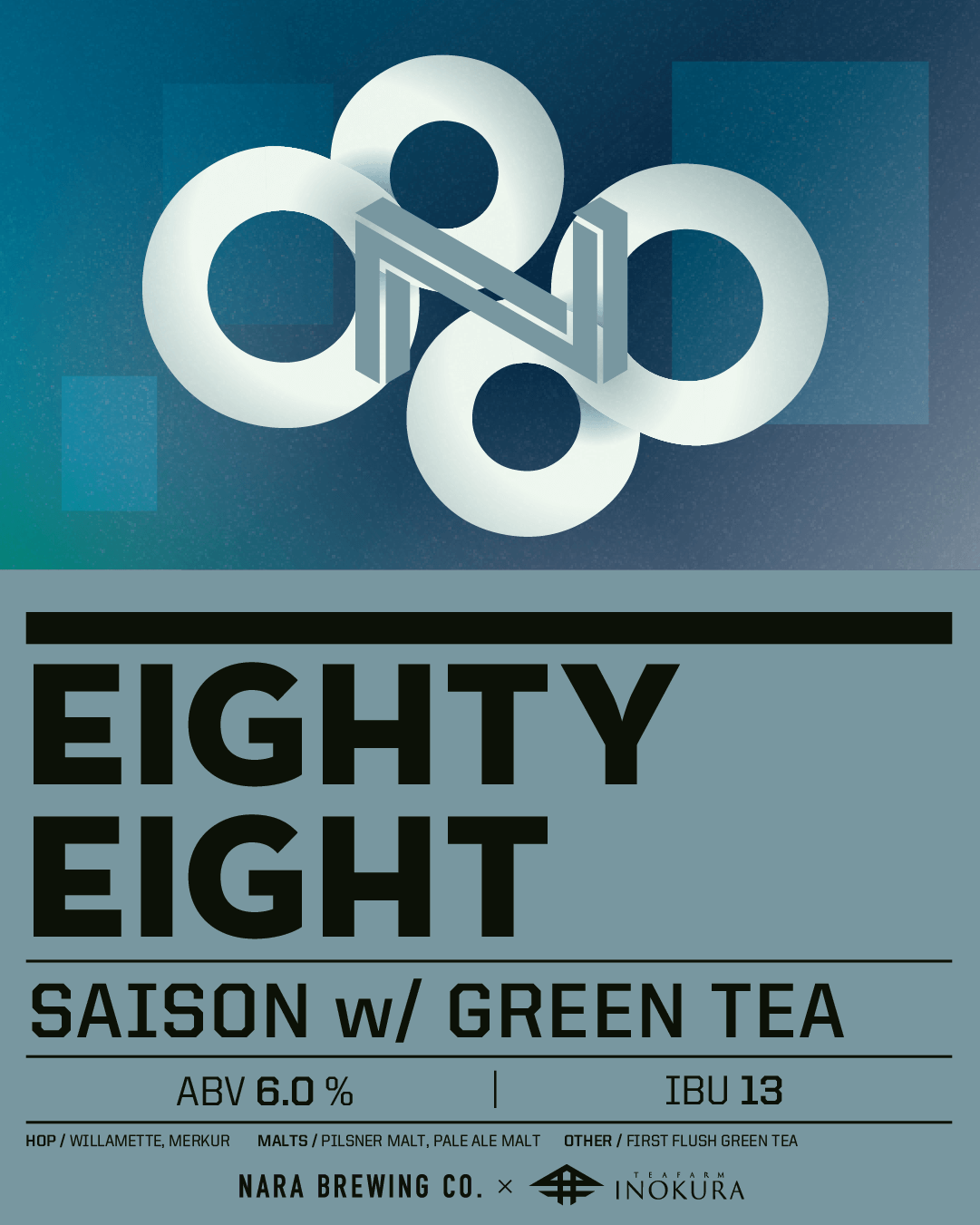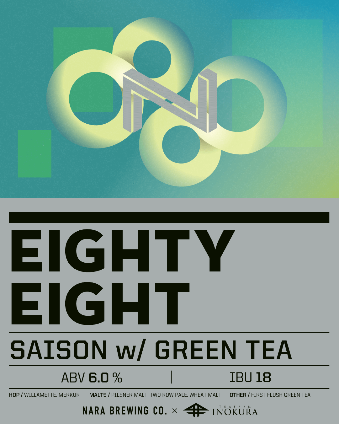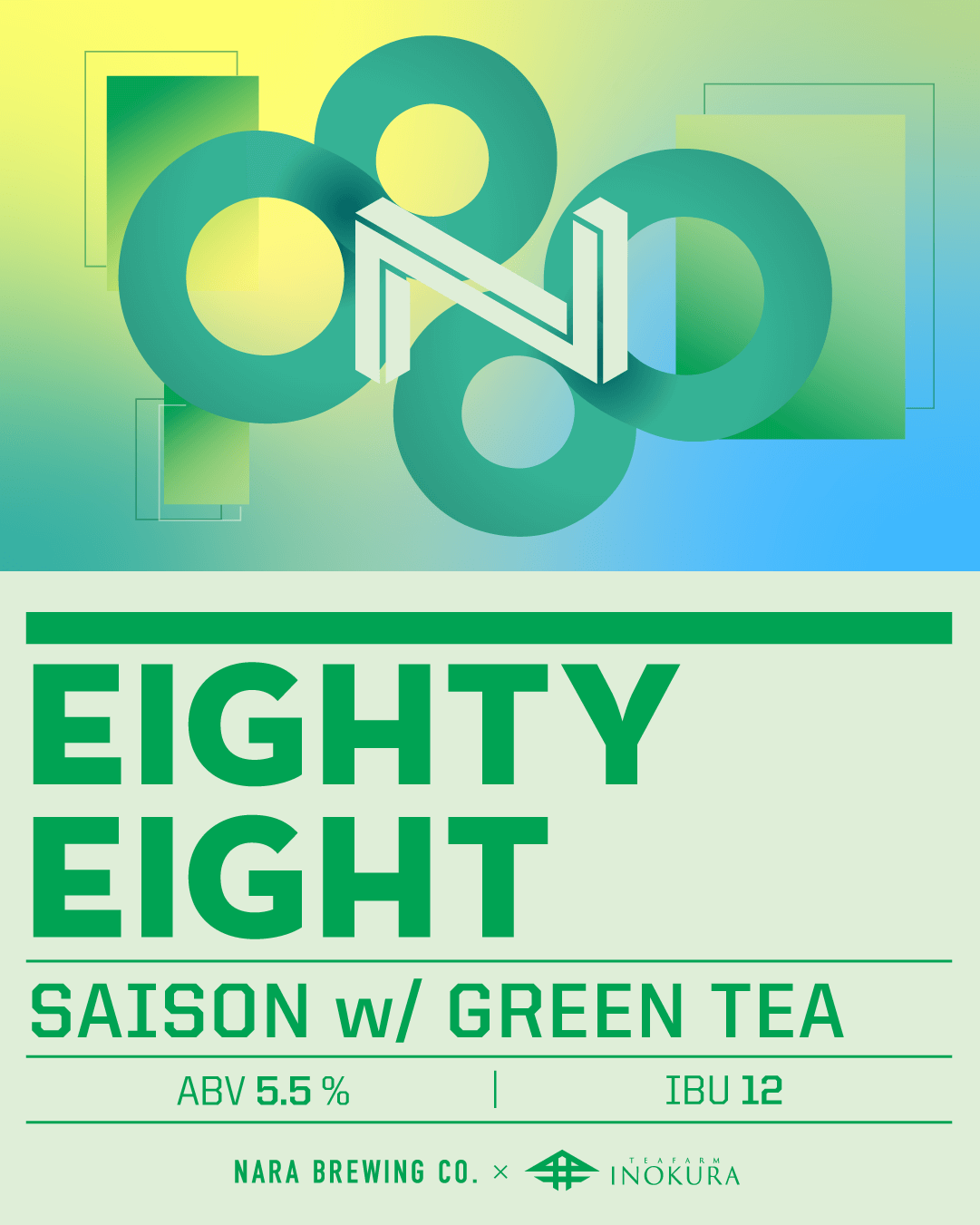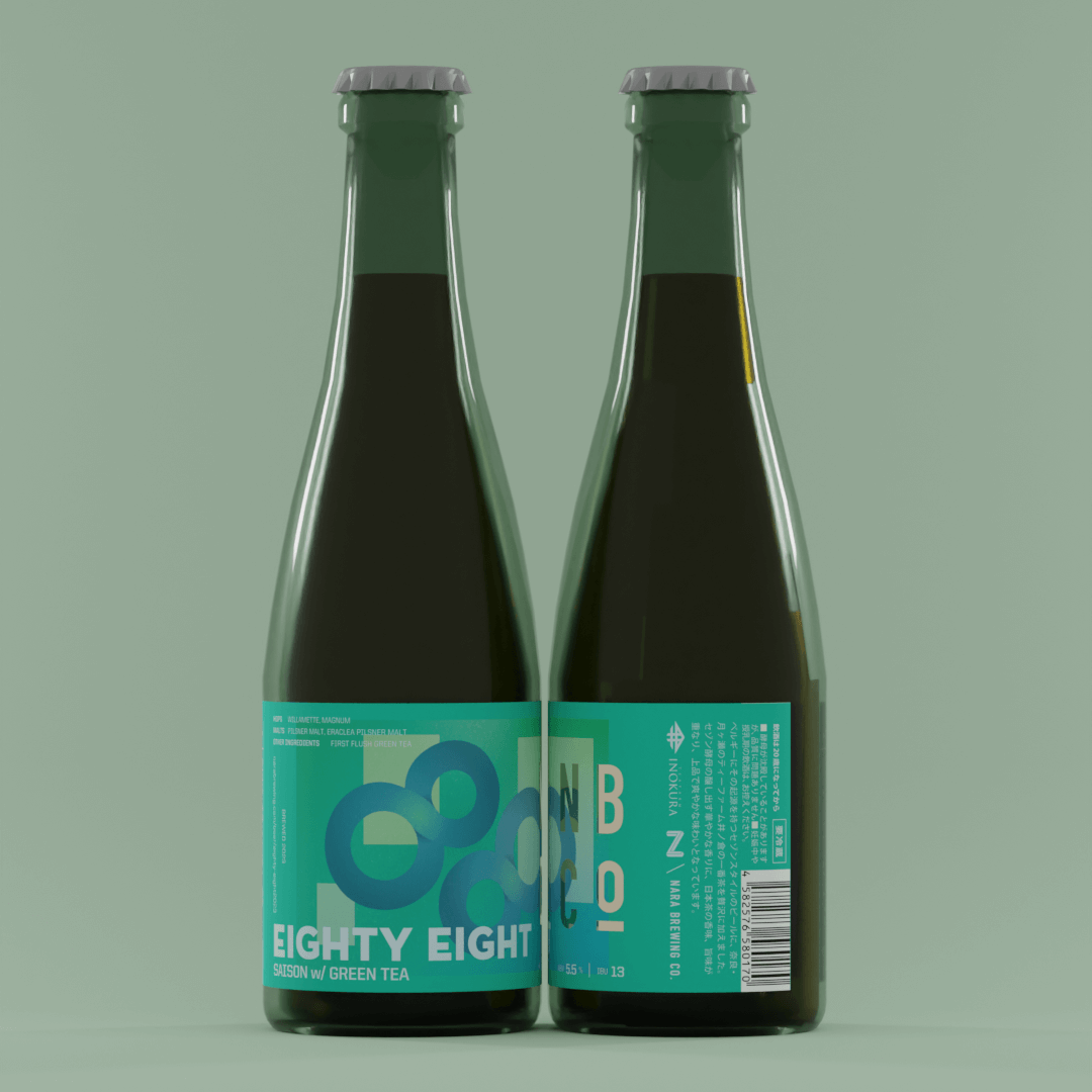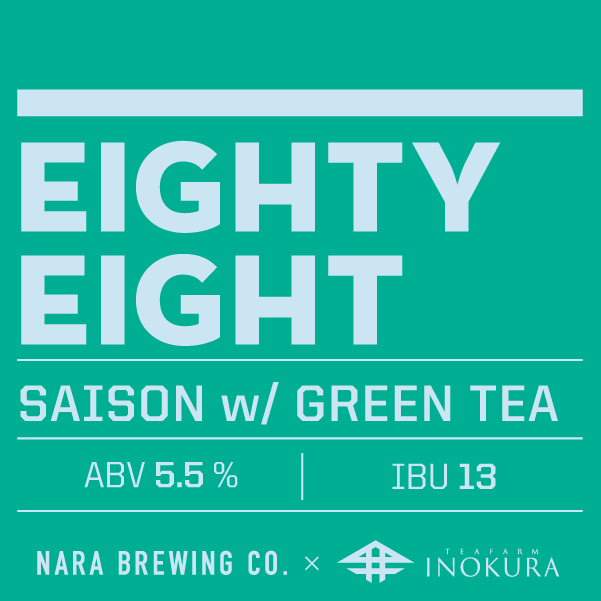 "Eighty Eight" is collaboration with Tea Farm Inokura, which has been in Tsukigase, Nara for more than 260 years, and provided us the green tea leaves that first flush in this season. The beer style is Saison. The characteristic is dry and drinkable, also beer that is both simple and complex, with the fruitiness aroma that comes from Belgian yeast. It looks a little bit hazy because of the tea leaves soaked, and when you tilt the glass, you can feel aroma like fruit from Saison yeast. Also, you can enjoy faint green tea flavor, and leaves long finish. The bitterness derived from tea leaves, which are different from hops, add complexity to this beer, adding layer to the taste.