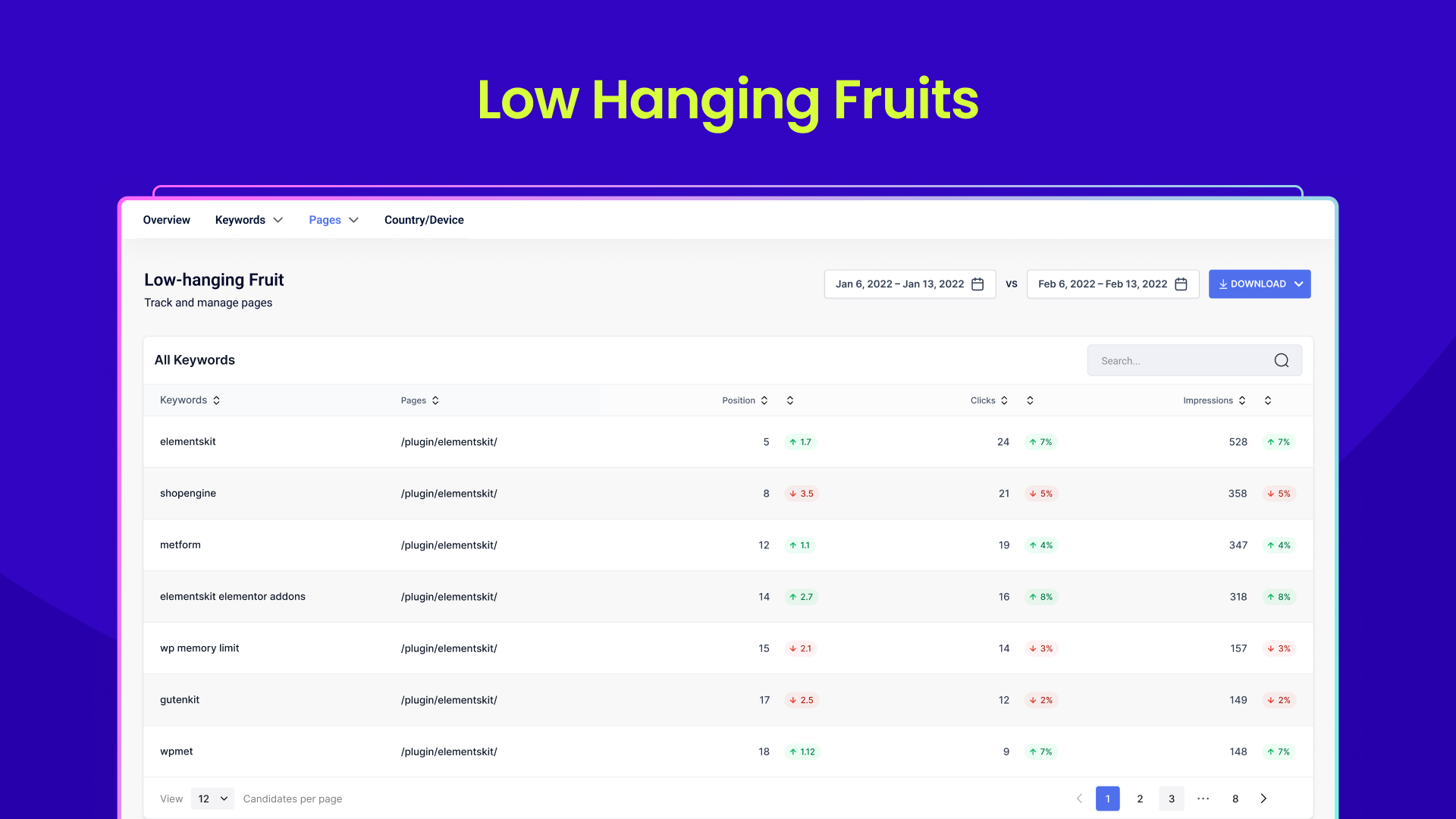 Also, find out the lost and new keywords in Google for a specified period. Explore opportunities to optimize with «low-hanging fruit keywords».