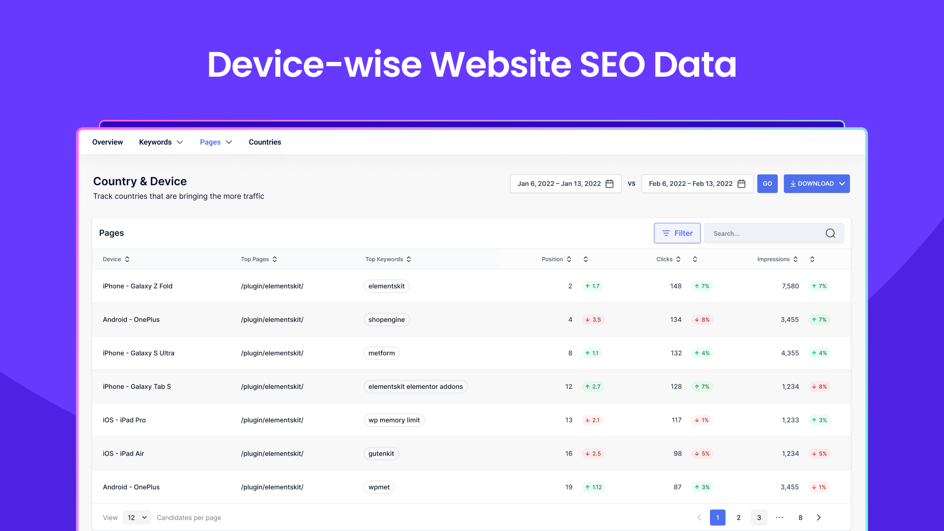 The SEO Insights feature lets you track the regions and devices your content generates the most traffic for. Plus, find out which keywords and pages rank highest in those regions.