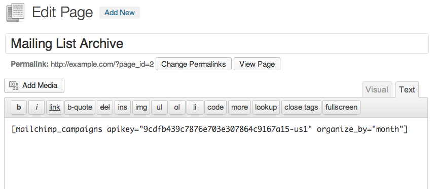 Example usage: [mailchimp_campaigns apikey="xxxxxxxxxx" limit="10" order="ASC" link_text="title"]