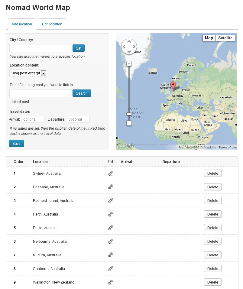- Choose from three different content types for each location. Either link to a blog post, write a custom description or show the travel dates.