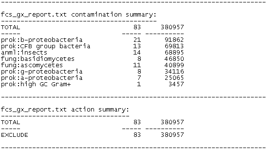 Figure 1. FCS-GX report showing the summary of contamination identified in a tomato genome. The output indicates there are 83 sequences, adding up to 381 kb total length, to be removed from a mix of insect, fungal, and bacterial sources.
