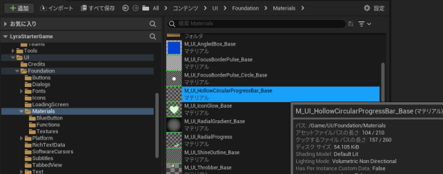 Lyra Starter Game サンプルにある M_UI_HollowCircularProgressBar_Base マテリアルが、ホールドの進行度を表現する例としてちょうどよさそうなので、今回これを利用することにする。