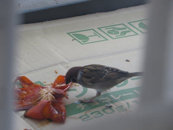 すぐには、スズメ達も食べに来なかったけど、17日には、恐る恐るやってきて柿を食べていた。