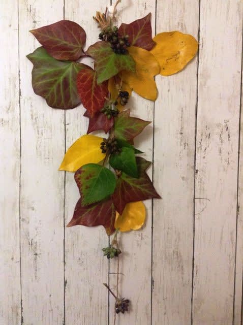 段ボールは品切れだから、カクレミノの実と葉っぱ数枚を組み合わせて、麻ひもで縛る。