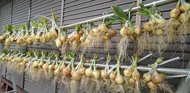 収穫して天日干ししたタマネギは