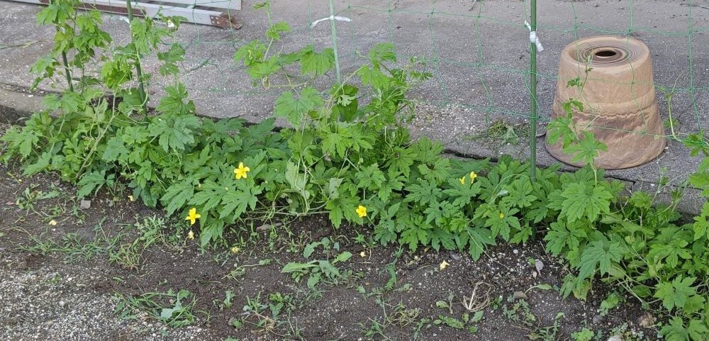 去年のこぼれ種から芽を出したゴーヤの手も立てないうちに