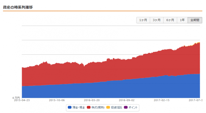 株などを保有している場合は、日々の時価総額を取得してグラフに反映してくれます。チャイナショックで、株式が結構目減りしたなんてこともわかりやすいかと思います。