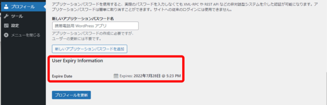 ユーザーの利用期限は、ログインした状態で「プロフィール」画面の下部に表示される「User Expiry Information」を見ることで確認できます。
