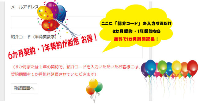 6か月契約、または、1年契約のお客様の場合に「紹介コード」を入力していただくと、新規契約のお客様の契約期間が無料で1か月延長されます。