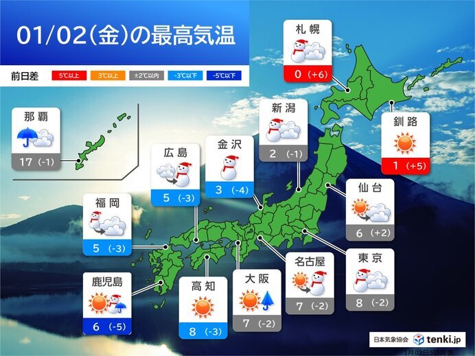 今日2日(金)も、強い冬型の気圧配置が続くでしょう。北日本から西日本の上空約5500メートルには、氷点下36℃以下の強い寒気が流れ込み、大気の状態が非常に不安定となる見込みです。 北海道と東北の日本海側は雪が降ったりやんだりで、沿岸部はふぶく所もあるでしょう。大雪のピークは過ぎましたが、これまでの雪で交通機関に乱れが出る可能性があります。昼頃にかけてご注意ください。 北陸や近畿北部、山陰、九州北部は断続的に雪が降り、局地的に雪の降り方が強まるでしょう。上空にこの冬一番の強い寒気が流れ込むため、局地的に雪雲が発達して、短時間に積雪が急増しそうです。山沿いだけでなく、平野部でも大雪に警戒してください。また、近畿中部や南部、山陽、四国など、太平洋側にも雪雲が流れ込み、普段雪の少ない市街地でも雪が降り、雪の積もる所があるでしょう。年始のお出かけは足元に十分ご注意ください。落雷や竜巻などの激しい突風、ひょうにも注意が必要です。 関東は、昼頃から山沿いや内陸部で雪や雨が降り、山沿いでは大雪のおそれがあります。夕方以降は、東京23区を含む平野部でも雪が降り、うっすら積もる所があるでしょう。積雪とならなくても、夜は気温が0℃前後まで下がる所が多く、雪や雨で濡れた路面が凍結する所がありそうです。スリップ事故など車の運転は十分ご注意ください。 東海は晴れ間が出ますが、午後は山沿いで雪の降る所があるでしょう。岐阜県など局地的に雪の降り方が強まりそうです。 沖縄は雨が降ったりやんだりでしょう。北よりの風が強く、海は高波に注意が必要です。