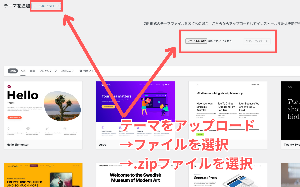 その後、「テーマをアップロード」→「ファイルを選択」をクリックして
