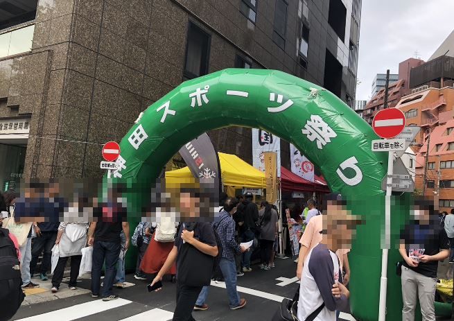 正面に見える緑色のアーチ部分がが祭り会場の入り口です