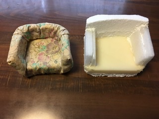 30年前に作った娘の人形用ソファは 布地を型に合わせて手で縫ったけど 今回は布地を 木工ボンドでペタペタ張って仕上げました。