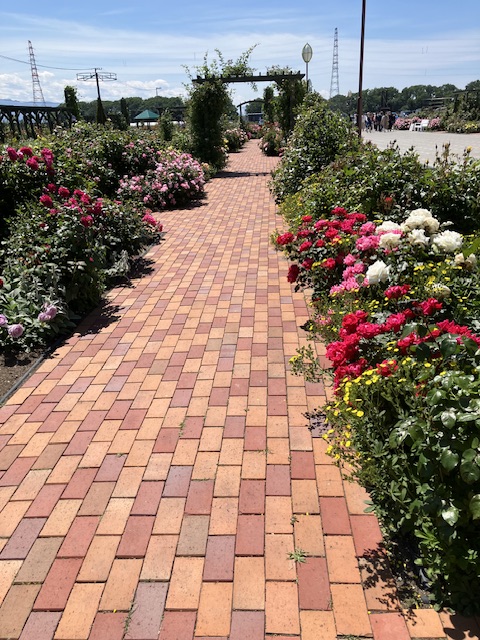 バラ園のメインレンガ道は バリアフリー対策で120~140㎝の道幅。
