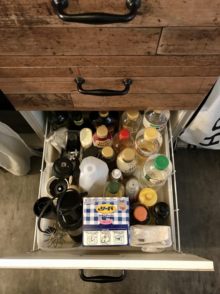 さてよく使う調味料、塩と砂糖は見せる収納でもなく、この引き出しにもありません。