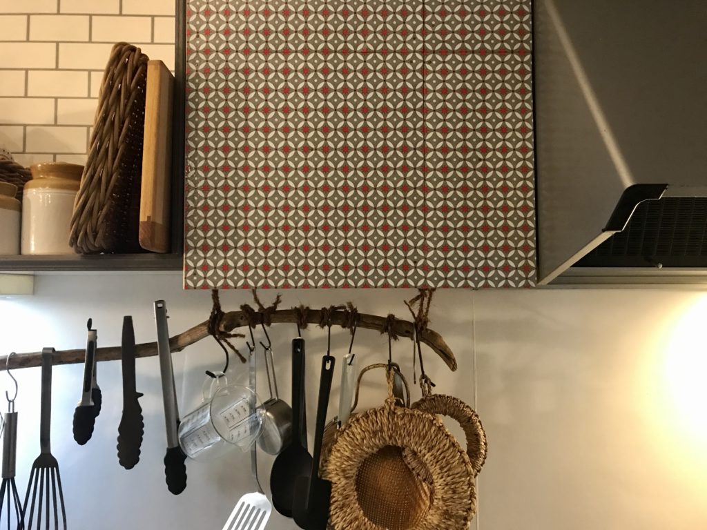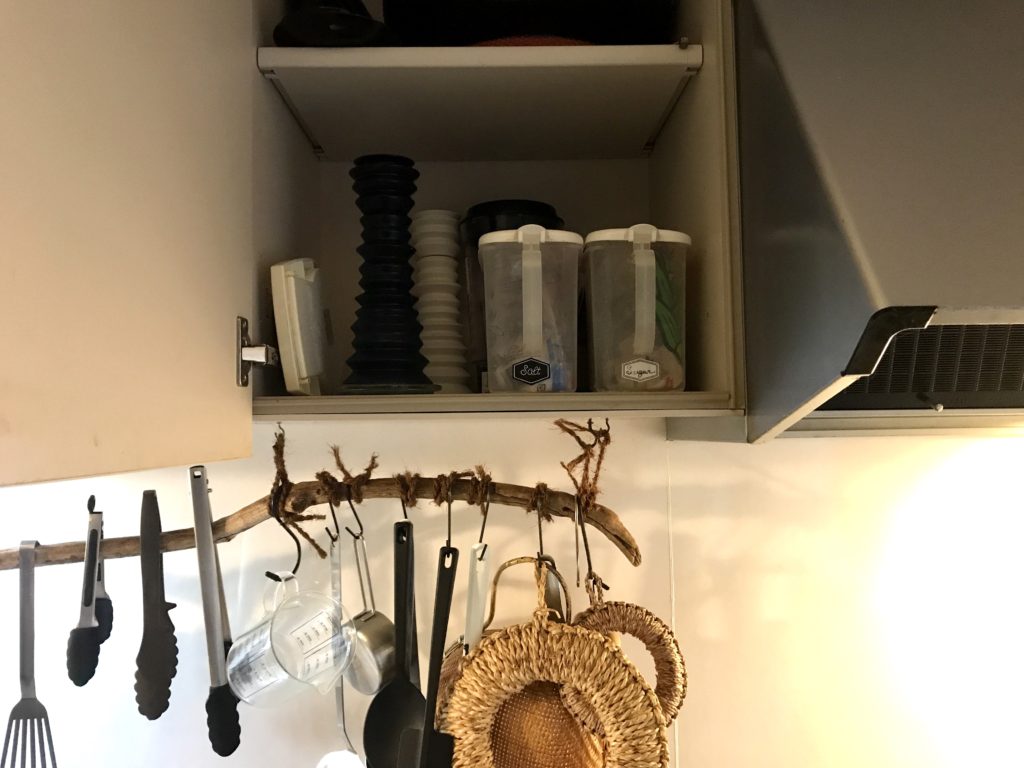 何度も見てきた光景ですが、キッチンツールはシンク上の流木に吊り下げてます。