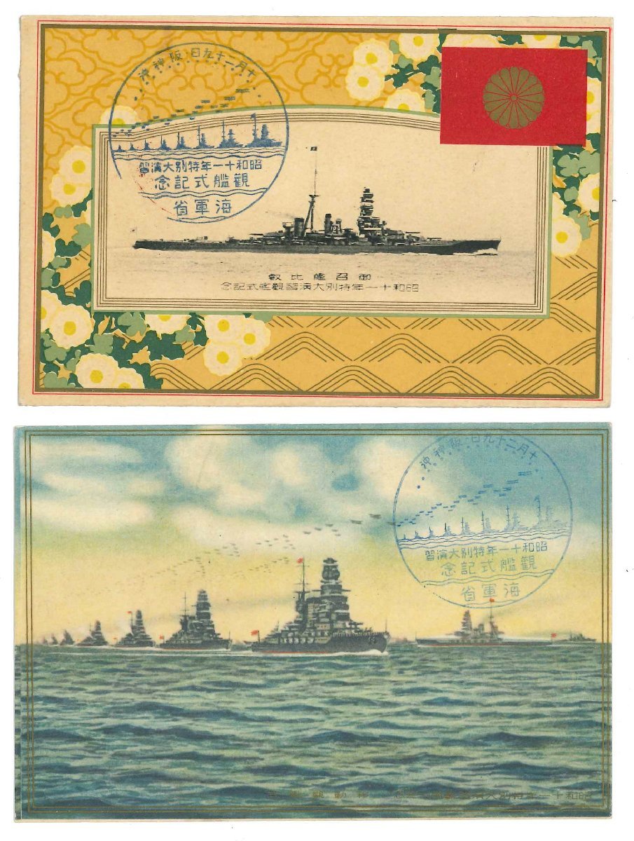 「昭和十一年度特別大演習」の最後を飾る観艦式が、10月29日朝から神戸沖で挙行されました。これは当時の記念絵葉書です。