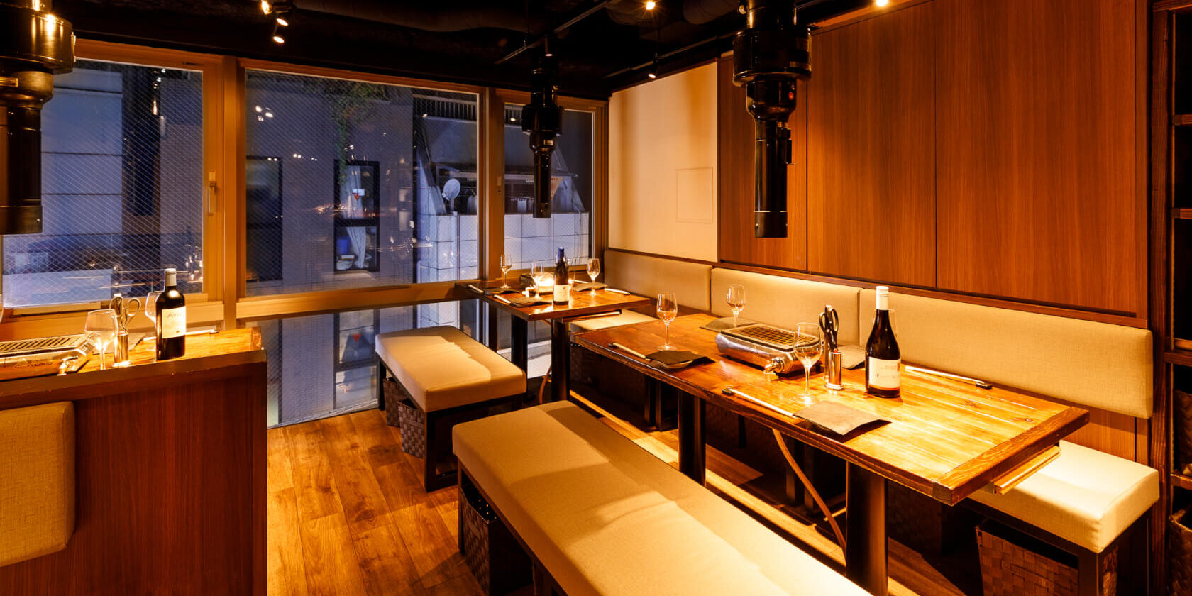 ニクアザブ恵比寿店のビル最上階に位置するニクアザブ恵比寿別館。2018年に増設されたこのフロアでは、都会の喧騒を見下ろしながら貸切利用も可能な予約必須の空間になっています。