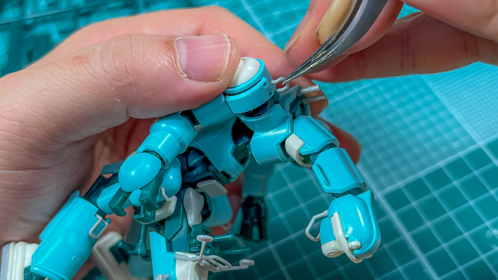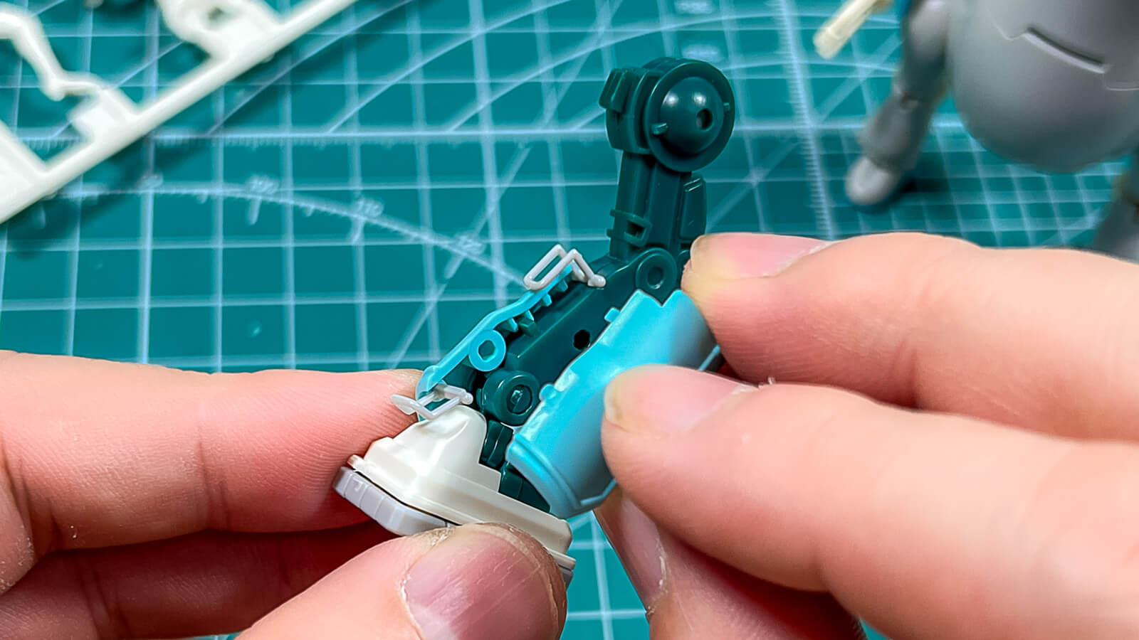 スネの上下端に配されたロールバーの部品。「え、コレ……お好みで接着しても良いオマケ部品じゃなくてデフォルトで組み立てに含まれる部品なの!?」と、指先で摘まむのも難しいほどに細かい部品が当然のように存在する。そしてこの部品は左右で挟み込む構成なのだけど、片方だけでは仮組みも利かない程度の渋みなのでポロッと落ちる。こういうプラモデルを組むのに慣れていないとそこそこ苦労する。しかもスネ上下端ふたつのロールバーを同時に挟み込まなくてはならない。スナップフィットでありながら器用さを試してくるんだな。