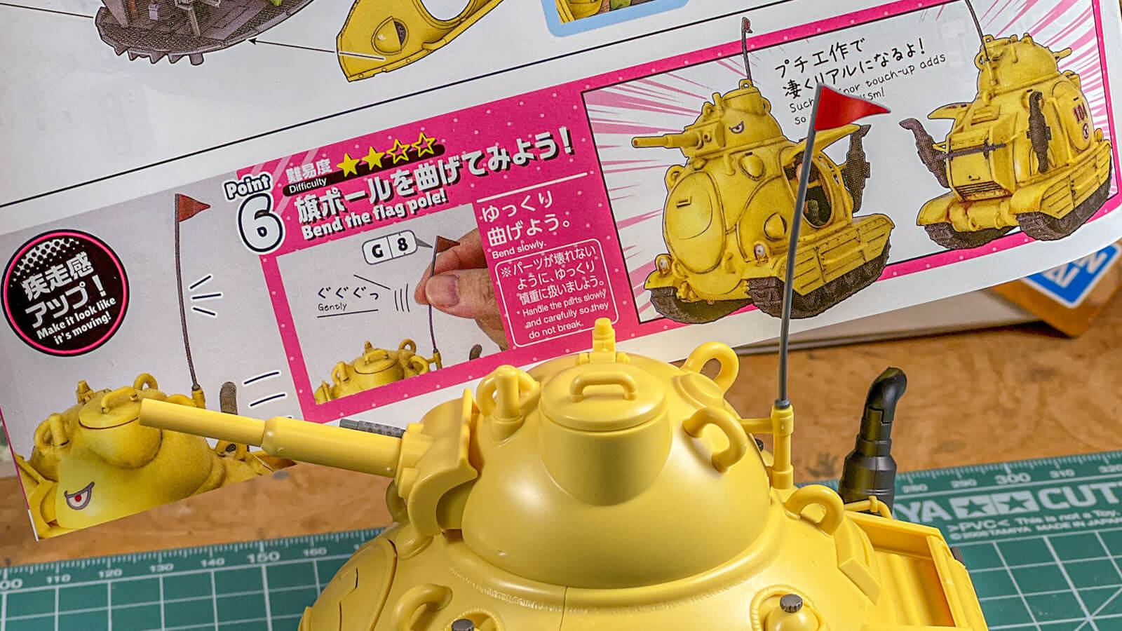 それでも鳥山明のイラストが「ポップにデフォルメされていてもリアリティを感じる」ように、このプラモはその表面的なルックス以上に「リアルな戦車模型」たらんとするギミックに溢れている。例えば説明書は要所要所で「組み立て」以外の「こうするといいぞ」を提案してくる有能なガイドになっている。に組み立てとは別に紹介されるワンポイントアドバイスも「ポールをしならせて加速時の疾走感を表現してみよう!」といった極めて演出的なアプローチの紹介をしつつ……。