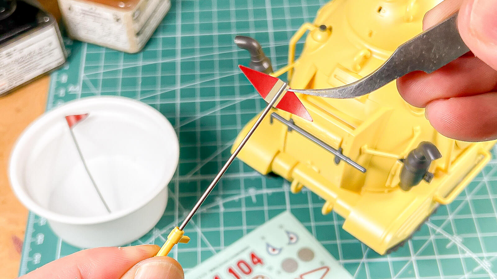 「戦車模型らしさ」を醸すためだけ(しかも決してソレが必須要素といえる訳ではない)に、わざわざオプションとして「金属線を使った旗竿」も用意。「まっすぐな丸棒はランナーに成形された細い丸棒なんかより、”本物”を使って質感も強度も全部アップグレードしようぜ!」というディティールアップのいろはを披露してくれる。