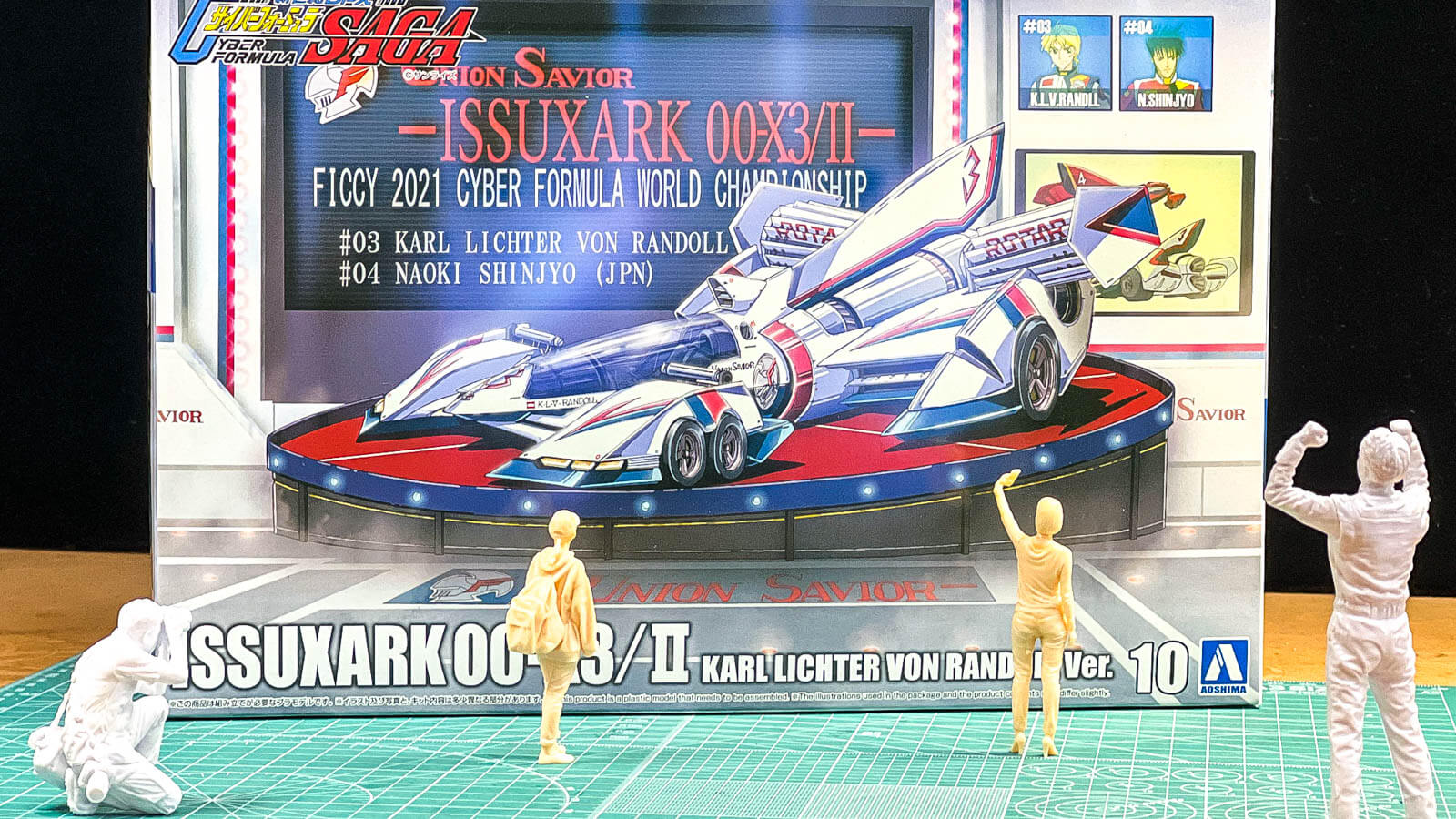 これは新マシンの発表会をイメージしたシチュエーション。アニメ本編で直接的に描かれたシーンではない。アオシマの1/24サイバーフォーミュラシリーズのボックスアートは今ではちょっと他に類を見ないくらいのサービス精神に溢れている。最新作であるイシュザーク 00-X3/Ⅱもその例に漏れないサービス満点の箱絵を用意してくれている。そのボックスアートを担当しているのは原作アニメでメカニカル作画監督を努めた重田智氏。今なら大ヒット中の『劇場版ガンダムSEED FREEDOM』のメカニックアニメーションディレクターも務める同氏による描き下ろし!…といったほうが通りがいいかもしれない。