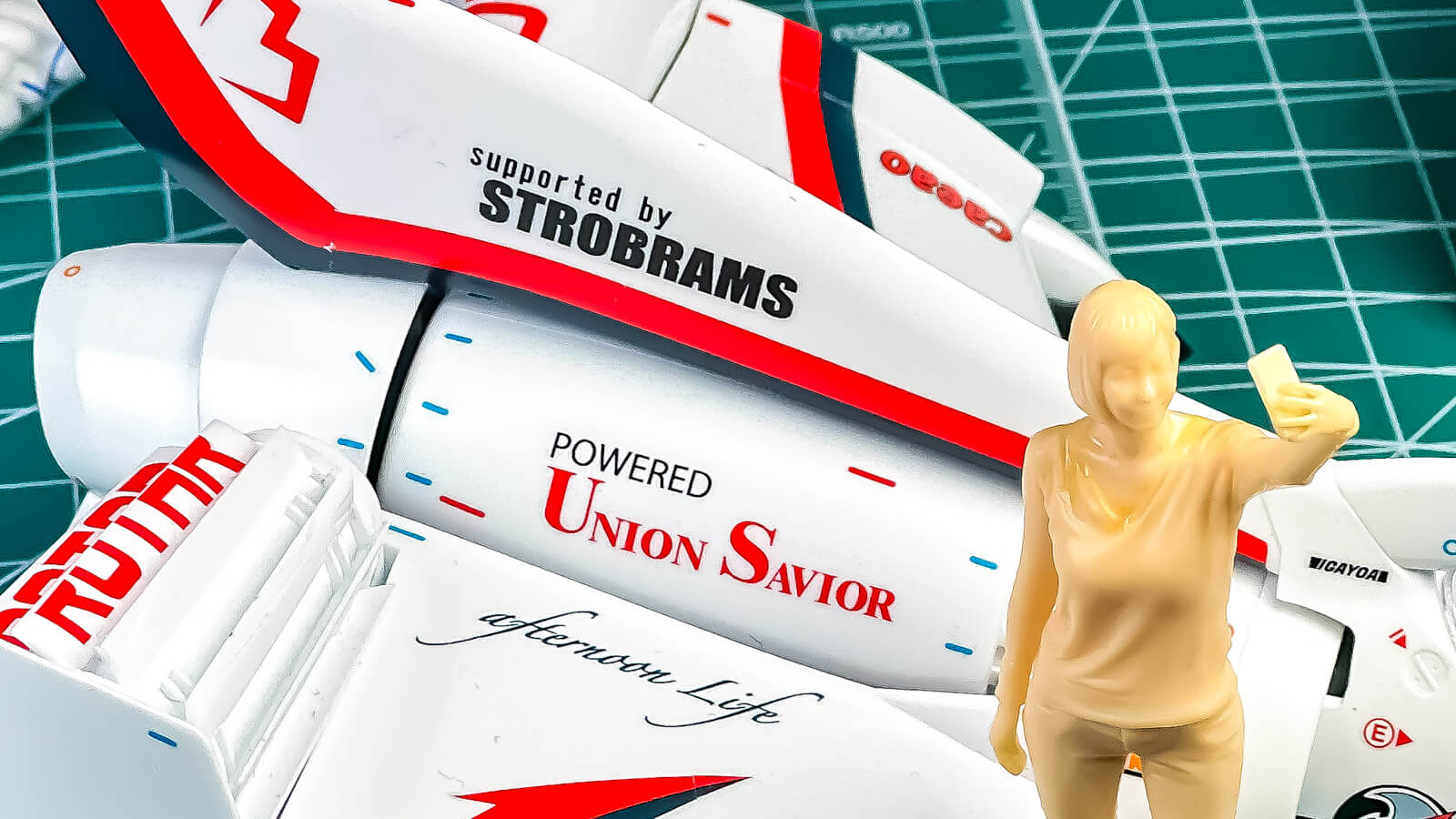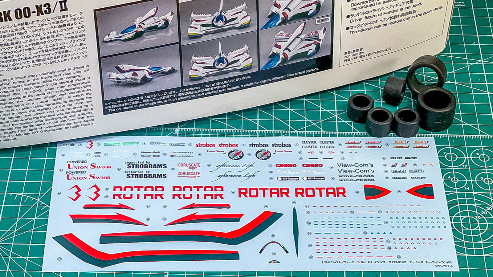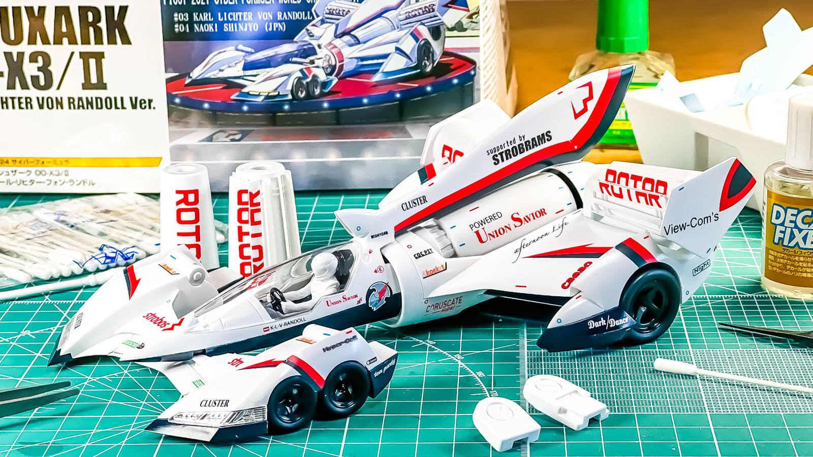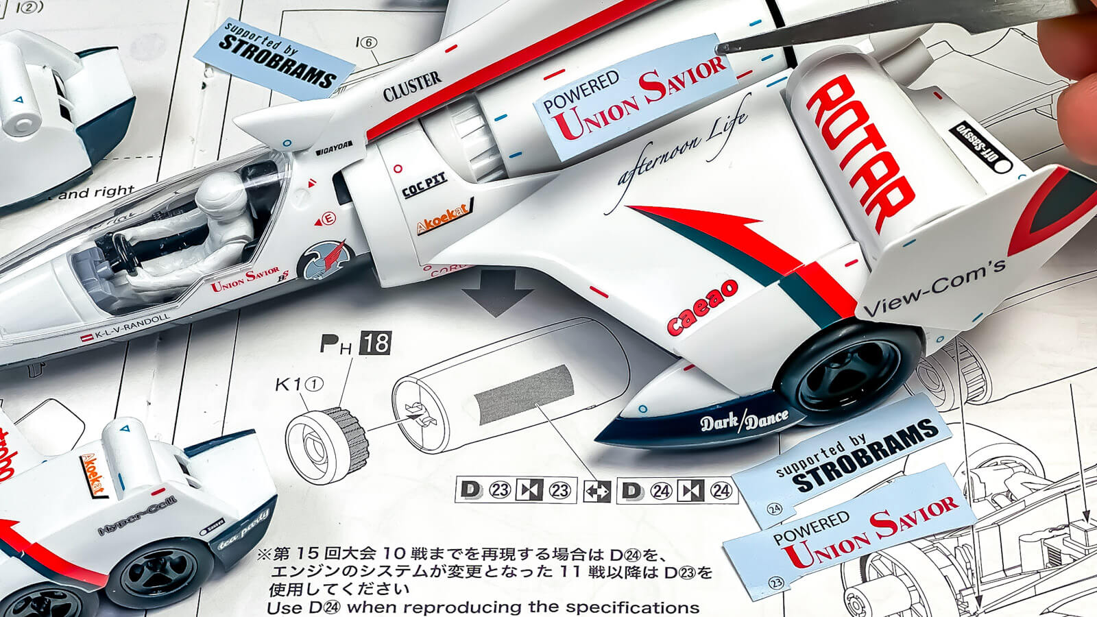 このデカールで面白いのは、シーズン途中で動力系を刷新する劇中設定を拾ってパワーユニットメーカーのロゴが二種類入っている所。シーズン第10戦以前(シュトロブラムス社製リニアホイール搭載型)と第11戦以降(ユニオンセイバー社製水素エンジン搭載型)をデカールの違いで表現できるようになっているのだ。でもその設定自体を説明することはしない。その態度がなんだかスケールモデルっぽい(「実物がそうなっているから」に帰結するので)。そういう意味じゃ「サイバーフォーミュラの世界線で売られているスケールモデル」っぽいともいえるわけで……アレ、コレってガンプラとかでやっているリアル考証とか考察ってやつじゃない?しかもかなり濃い目の……。