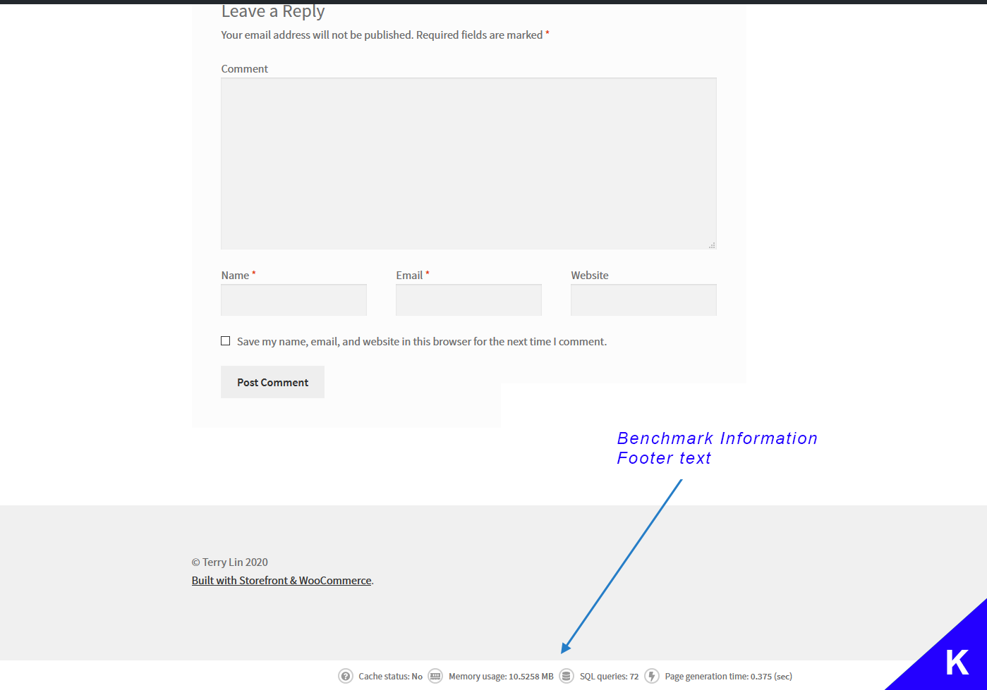 - Enable the benchmark information in the footer section as shown in screenshot (K), where you can see the cache status.