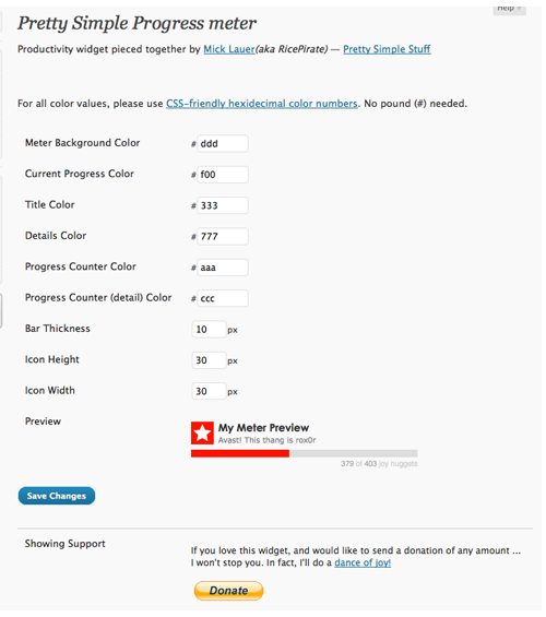 The Pretty Simple Progress meter widget is dedicated to my wife, Alison, as well as my entire family. Without their support and inspiration, I would likely be sleeping in a ditch, rather than making this WordPress widget.