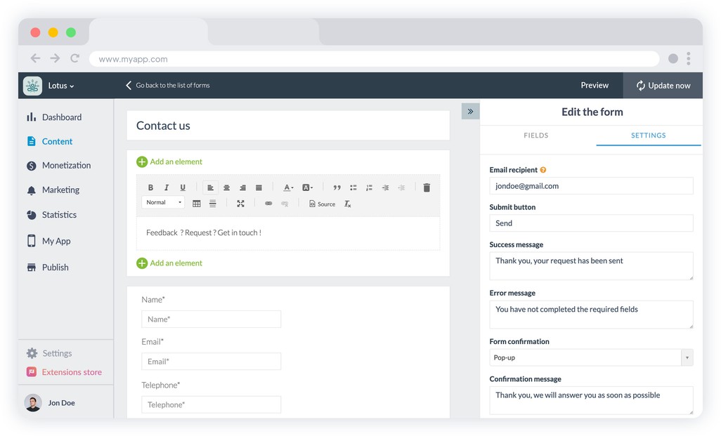 Zodra de activering van de module is voltooid, wordt in het menu van uw app een nieuwe Formuliersectie weergegeven. U kunt de naam aanpassen aan de functie die u eraan wilt toekennen. Daarna hoeft u alleen nog maar uw formulier te ontwerpen! Stel uw formulier samen door te kiezen uit 16 verschillende soorten velden: vrije tekst, selectievakjes, keuzeknoppen, vervolgkeuzemenu's, datum, telefoon, bestand en nog veel meer. U kunt uw formulierbeschrijving structureren door middel van verschillende typen blokken (tekst, foto, video, citaten, ...) met een geavanceerde en krachtige teksteditor, waarmee u gemakkelijk uw lay-outs kunt maken en uw tekst kunt markeren.