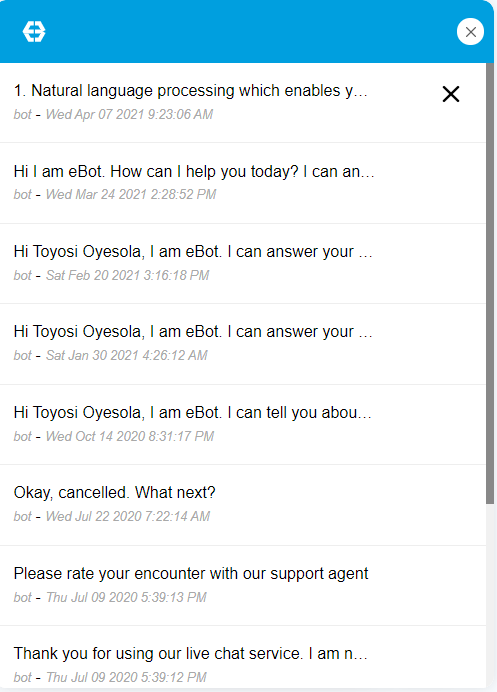 Chat history view for each chat session. You can click on each item to see the message history – (screenshot-4.png) https://drive.google.com/file/d/1T9X0ARx8NtcfeGKM7BlDMVOGNmw4_pCR/view?usp=sharing