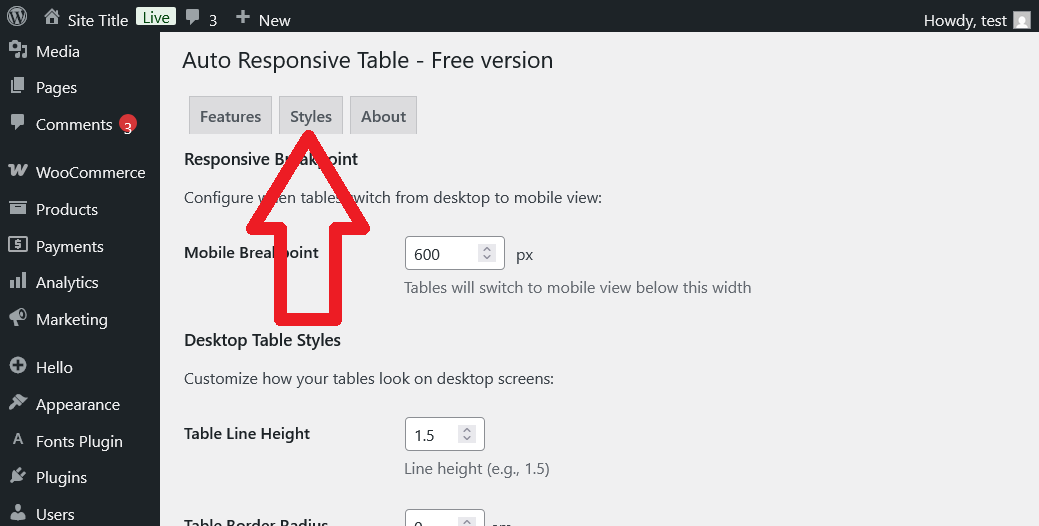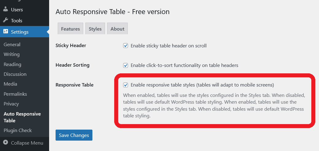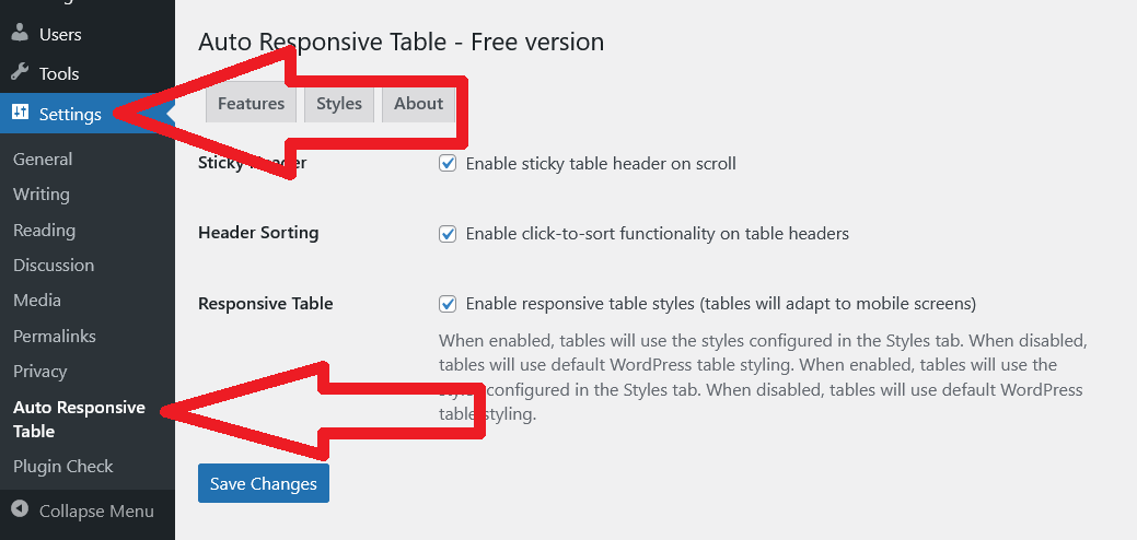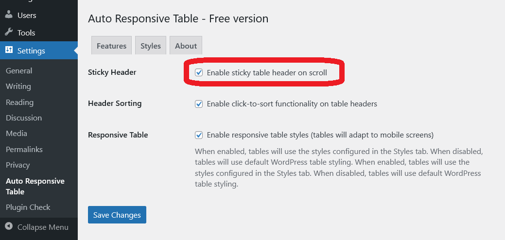 Step 2. Go to «Settings» page to turn On or Off the Features. You may read online Documentation for WordPress PlugIn for Auto Responsive Table with Sticky Table Head, Header Sorting and Table CSS Style Customization here.