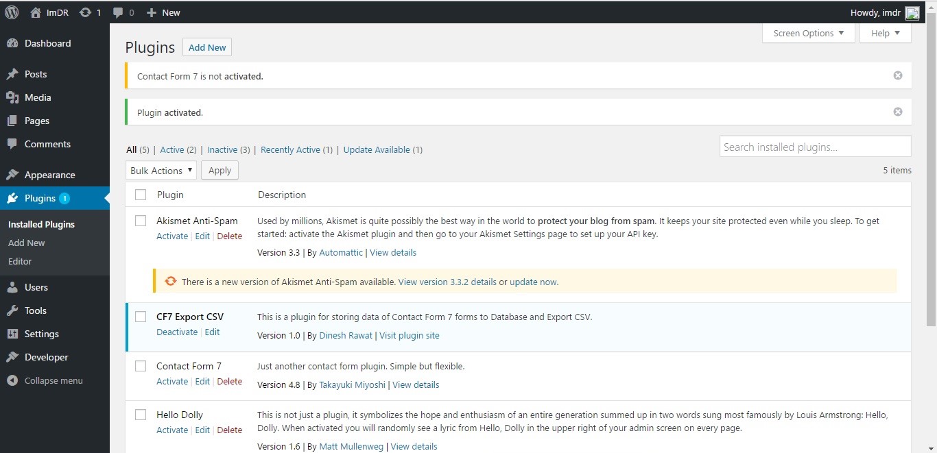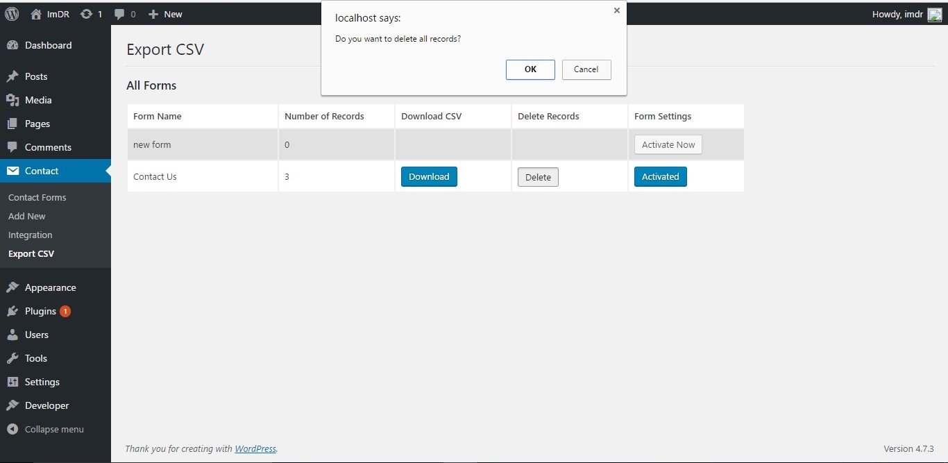 - Activate CF7 Export CSV plugin. It shows a message if Contact Form 7 is not downloaded or not activated.