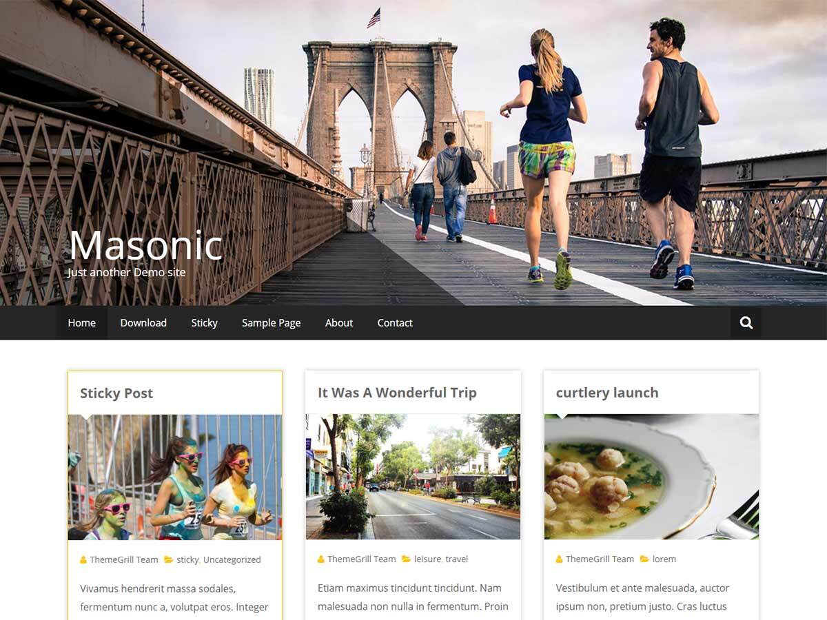 Masonic is responsive and retina ready WordPress theme suitable for blogs and has beautiful masonry layout. Theme has options like primary color, link color, custom CSS etc. which you can change from Theme Customizer. Also, supports Breadcrumb NavXT plugin. Get free support at https://themegrill.com/contact/ and check the demo at https://themegrilldemos.com/masonic/