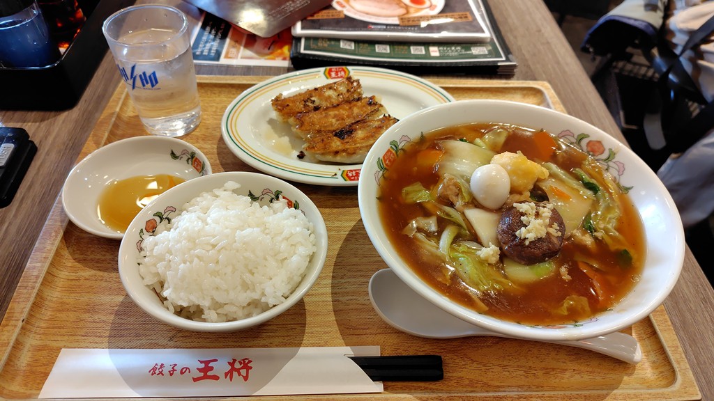 12月&1月限定の五目あんかけラーメンは単品もありますが、フェアセットというヤツで白飯(小)とジャストサイズ餃子(3個)との組み合わせを選んでいます。 ちなみに、+150円でフルサイズ餃子に変更できますが最近は少々控えているのです。