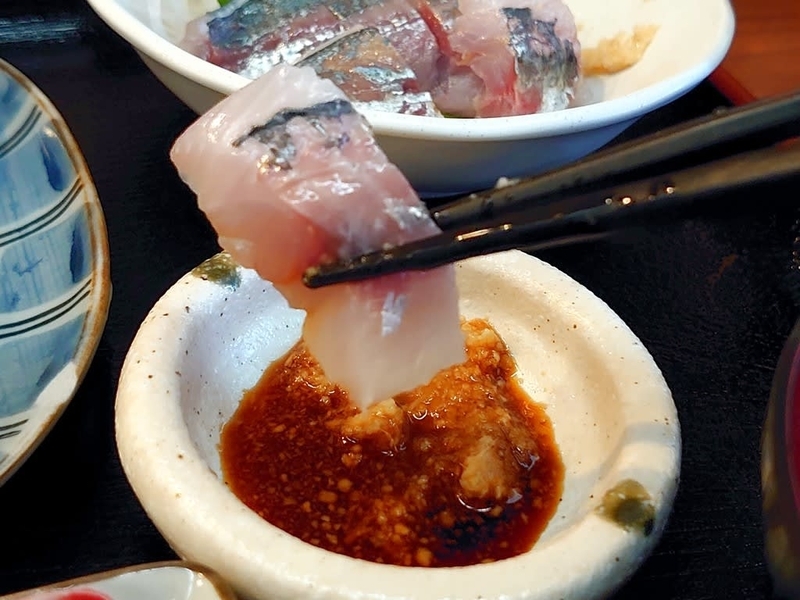 先ずは鯵刺しからとりかかりますが、三角食べと「お口丼」を組み合わせていただきます。 えっと「お口丼」については、あらためて解説する機会を設けようと思いますので、今回は軽くスルーしておいてください。