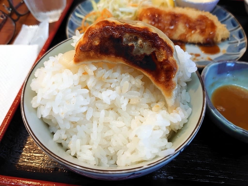 アジフライの一枚目と二枚目の合間に我妻から みそ餃子の一片がみそだれと共にパスされます。 ちなみに、我妻はみそ餃子とアジフライの組み合わせという不思議な組み合わせではありますが、店名を冠した定食を選んでおります。