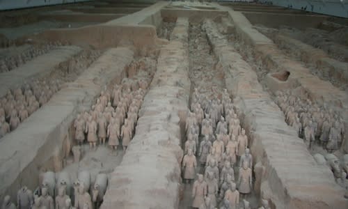 秦の始皇帝陵の副葬坑といわれ、人間、馬、馬車など等身大の7000以上の巨大埴輪(土偶)群はだだっ広い体育館のような建物に完全に覆われています。
