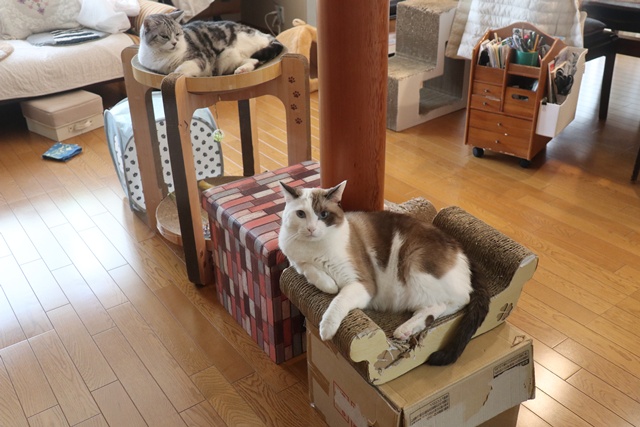 蘭ママさんへ;窓枠がなくて残念ですが、猫達は上手に自分の居心地の良い場所を見つけていますよね💕
