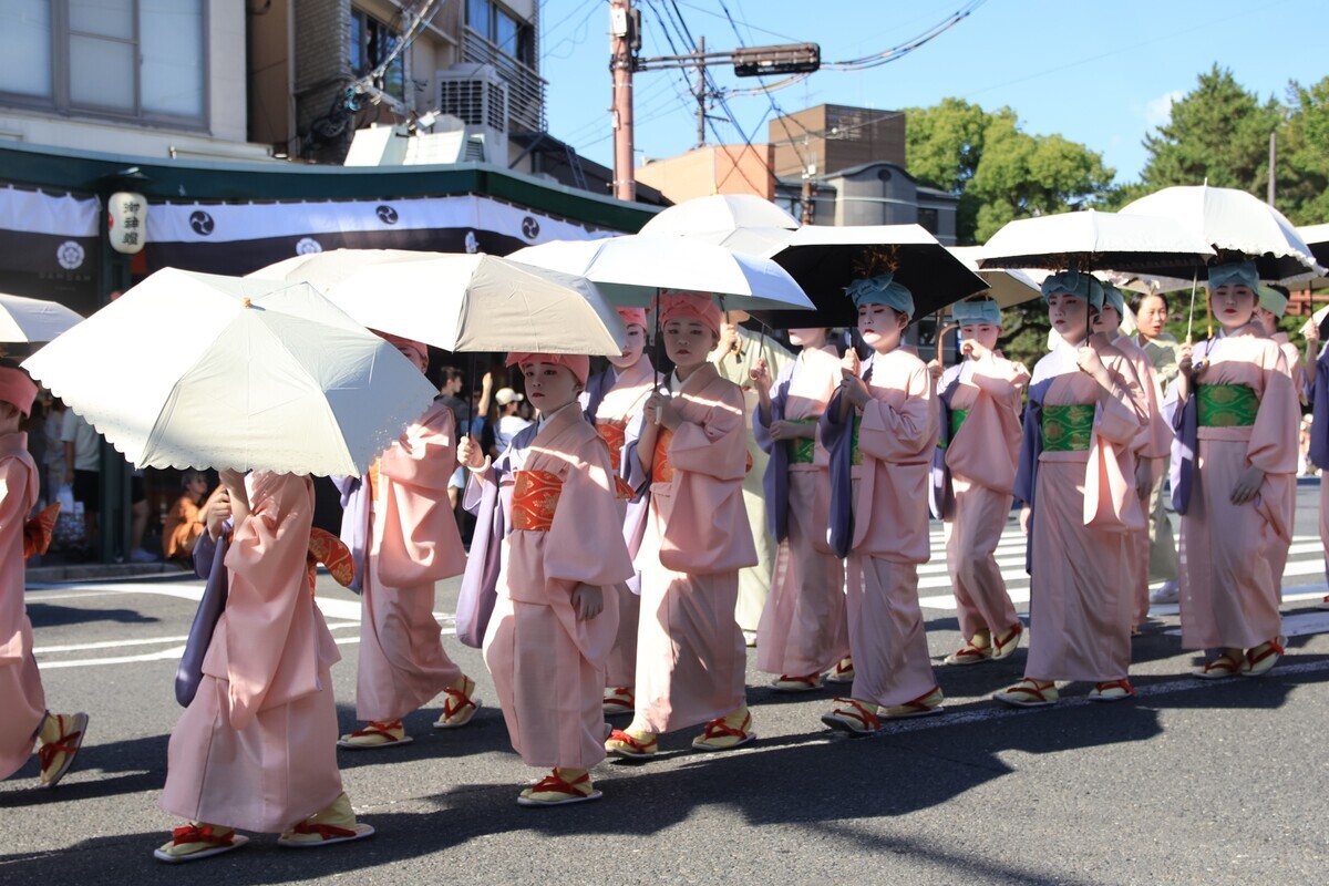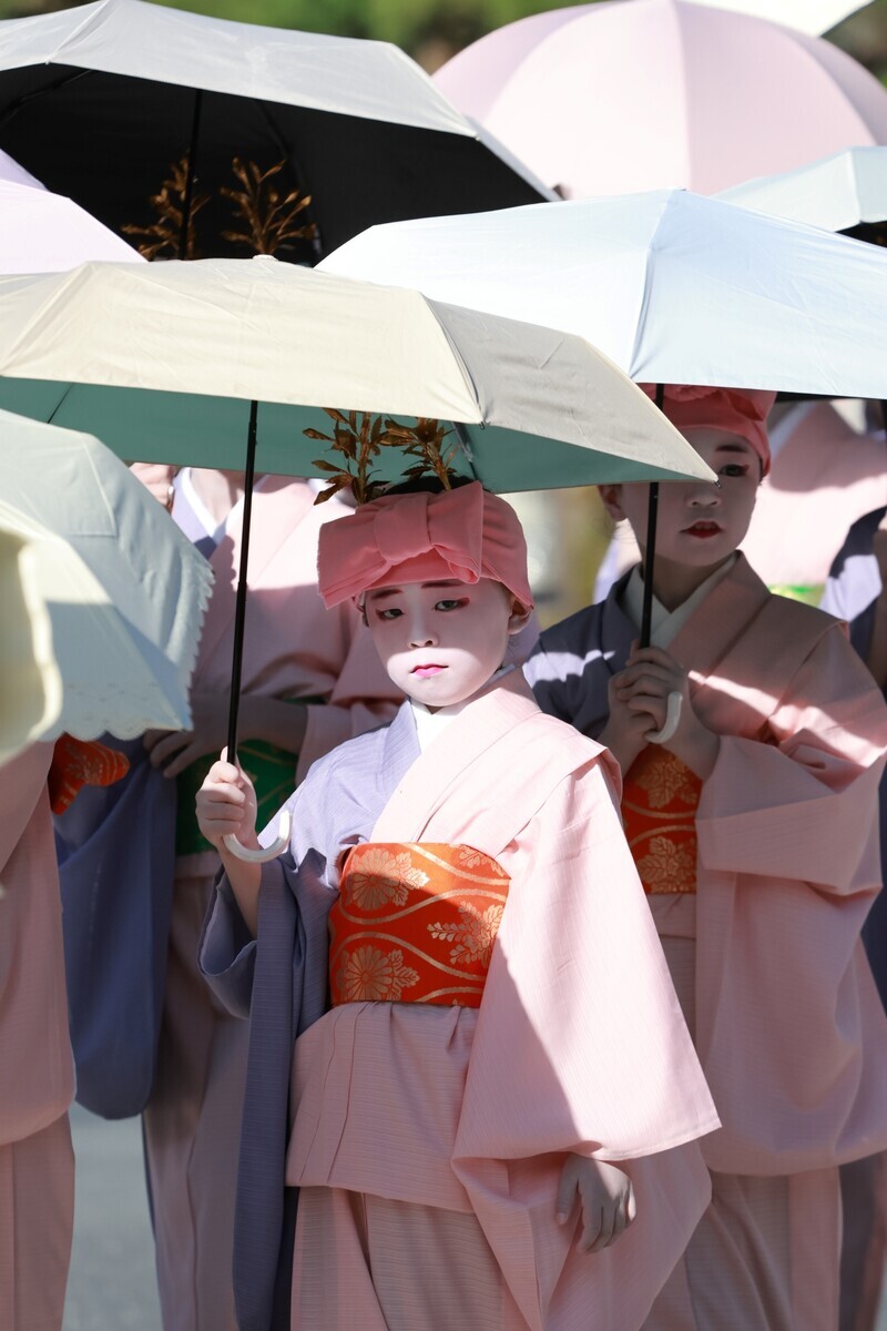多くの子どもたちと付き添いのお母さん(?)が和傘ではなく遮光の日傘を持って巡行してますねぇ…