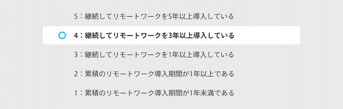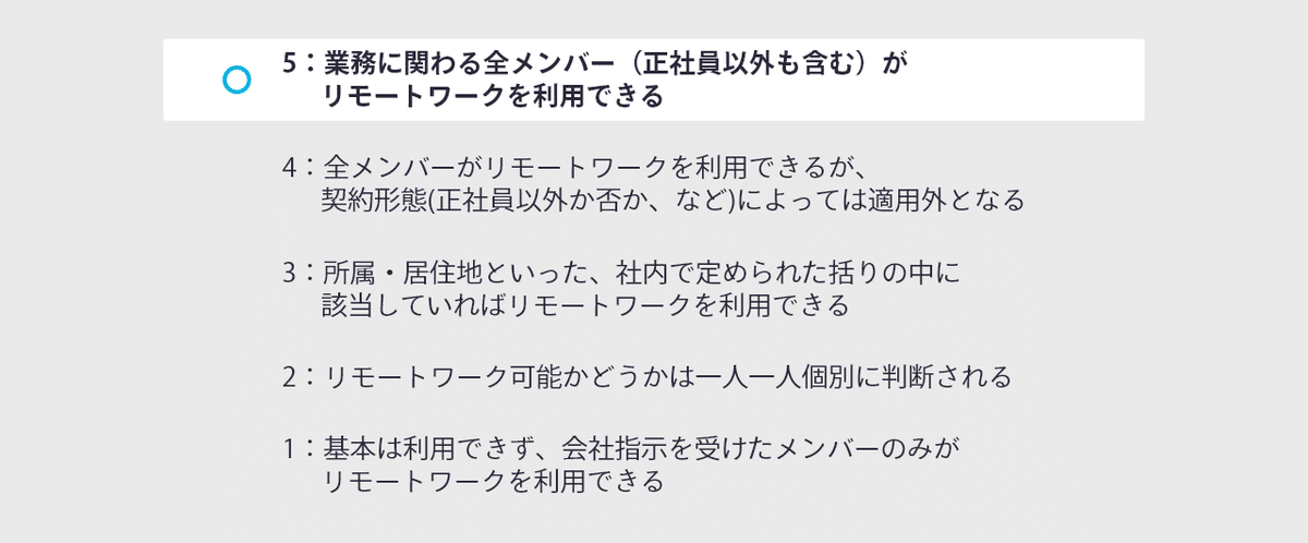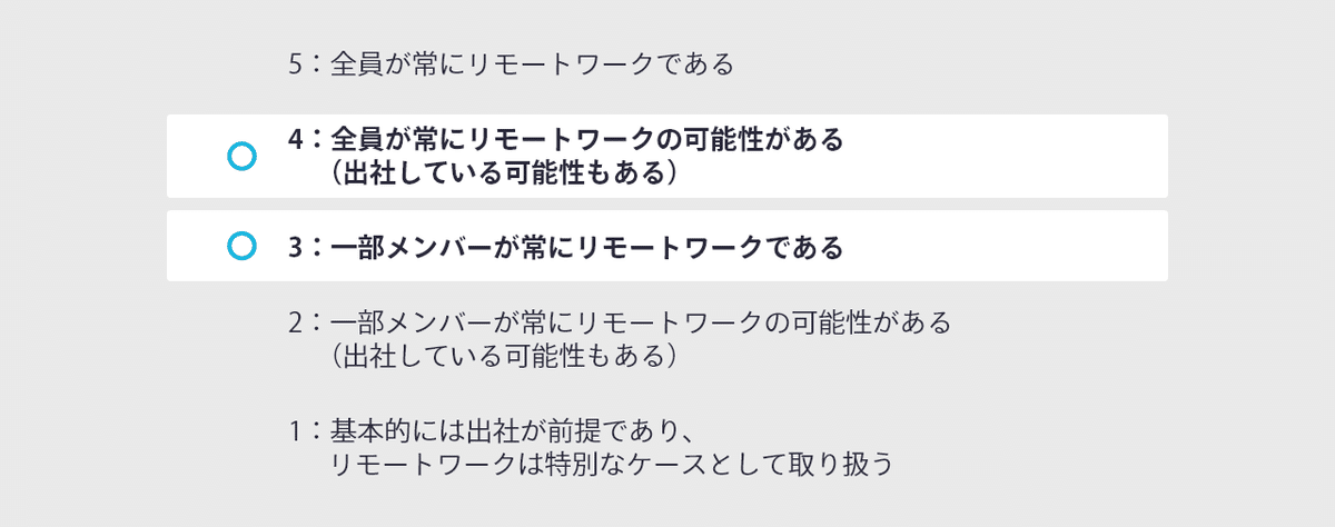 全メンバーのうち、どの程度がリモートワークに関わっているか。 リモートワークの課題が全員のものとなるか、「リモートワークのひと」の課題となるかの違いがある。