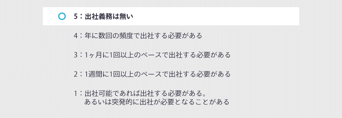 業務上必須とされる出社がどの程度発生するか。 「義務」としての出社のみ数える。出社が伴うイベントだとしても個々の判断で出社せずにオンライン参加が可能なケースなどは含めない。