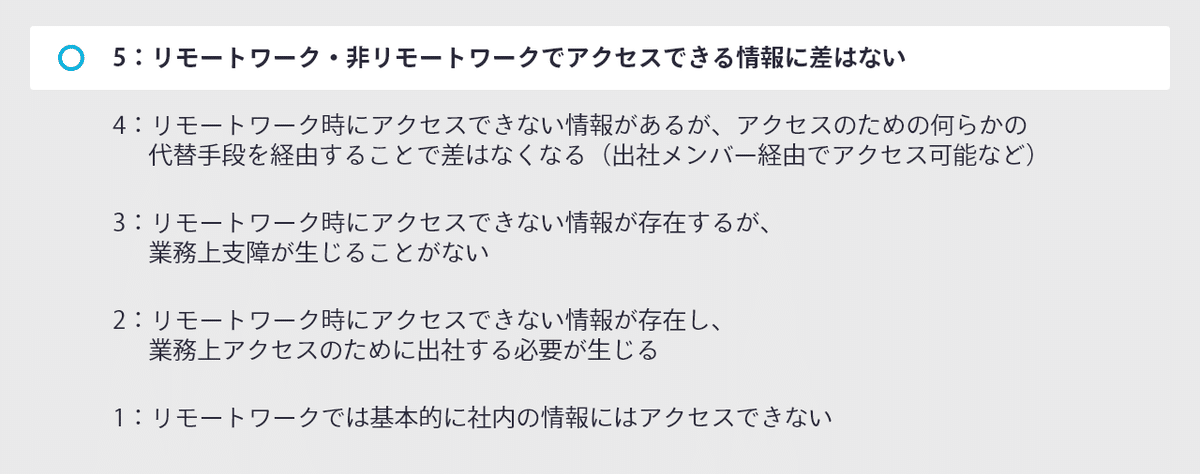 リモートワーク時と非リモートワーク時に、アクセス可能な情報量にどの程度差があるか。 また、差がある場合にはそれをカバーする手段が用意されているかどうか。