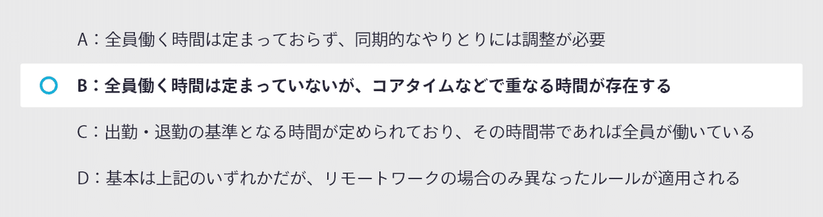 リモートワークで働くにあたって、どういった時間帯に仕事をするか。 これによって同期・非同期の割合が決まったり、非同期の場合もレスポンス速度が変わってくる。