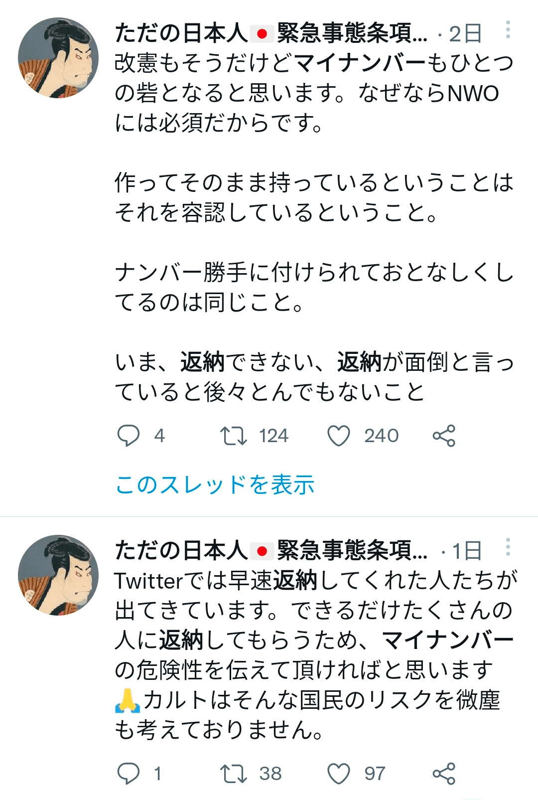 また、そんなに不安であればスマホを捨て、免許証を返納してしまえば良いのではないかと考える人もいるだろうが、そうしないところに本邦陰謀論者の根性のなさが表れている。その時その時で陰謀論に則った儀式を行い、あるいは仲間と交流して脳内麻薬が出せれば良いのであり、例えば警察が絡むとすぐに発言を翻すが、仲間のところに戻るとまた陰謀論を発信し始める。その程度の覚悟しかない人がほとんどだ。