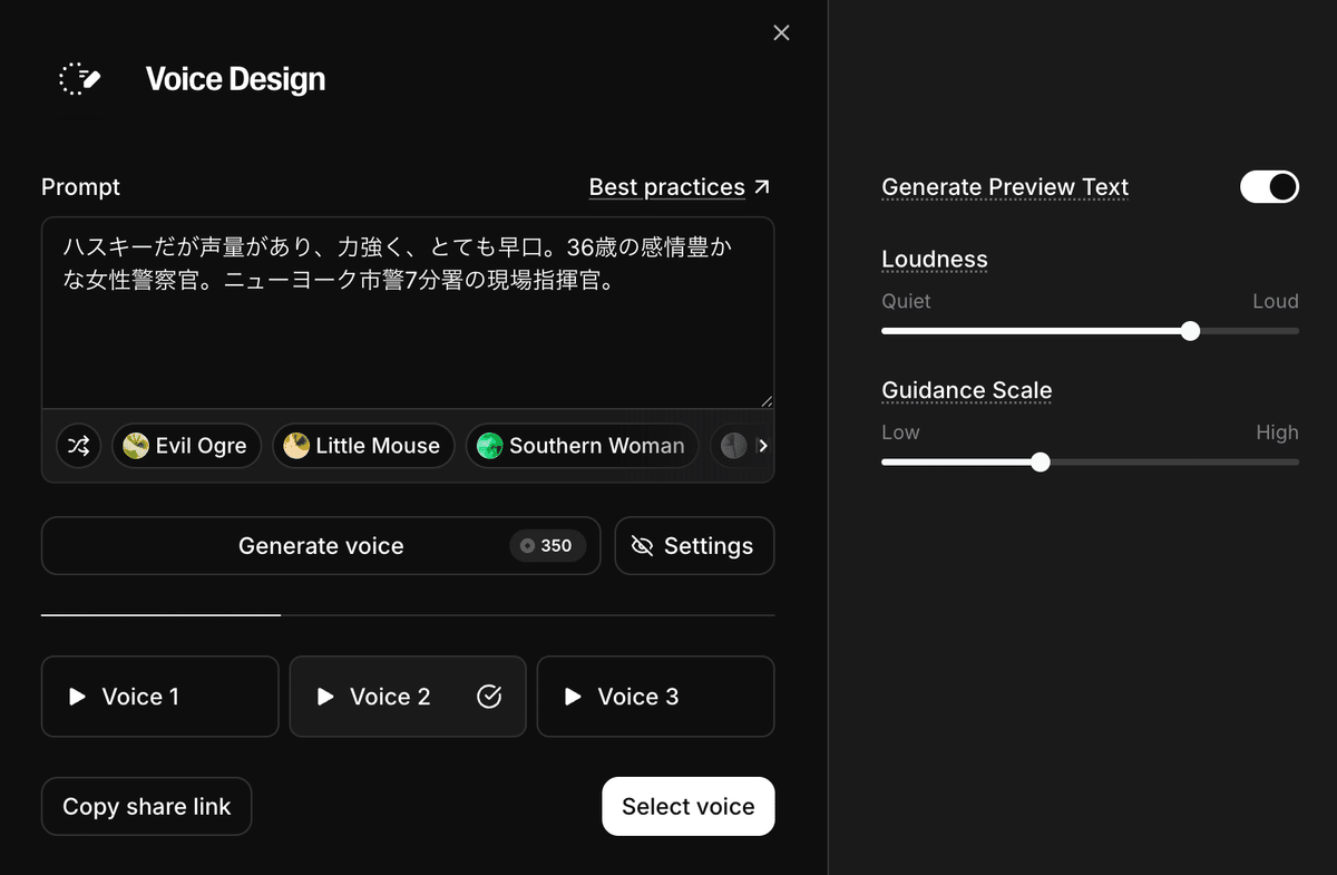 プロンプトで「声」の候補を3つ生成し、意図したイメージになるまでプロンプトを変更して生成し直す。