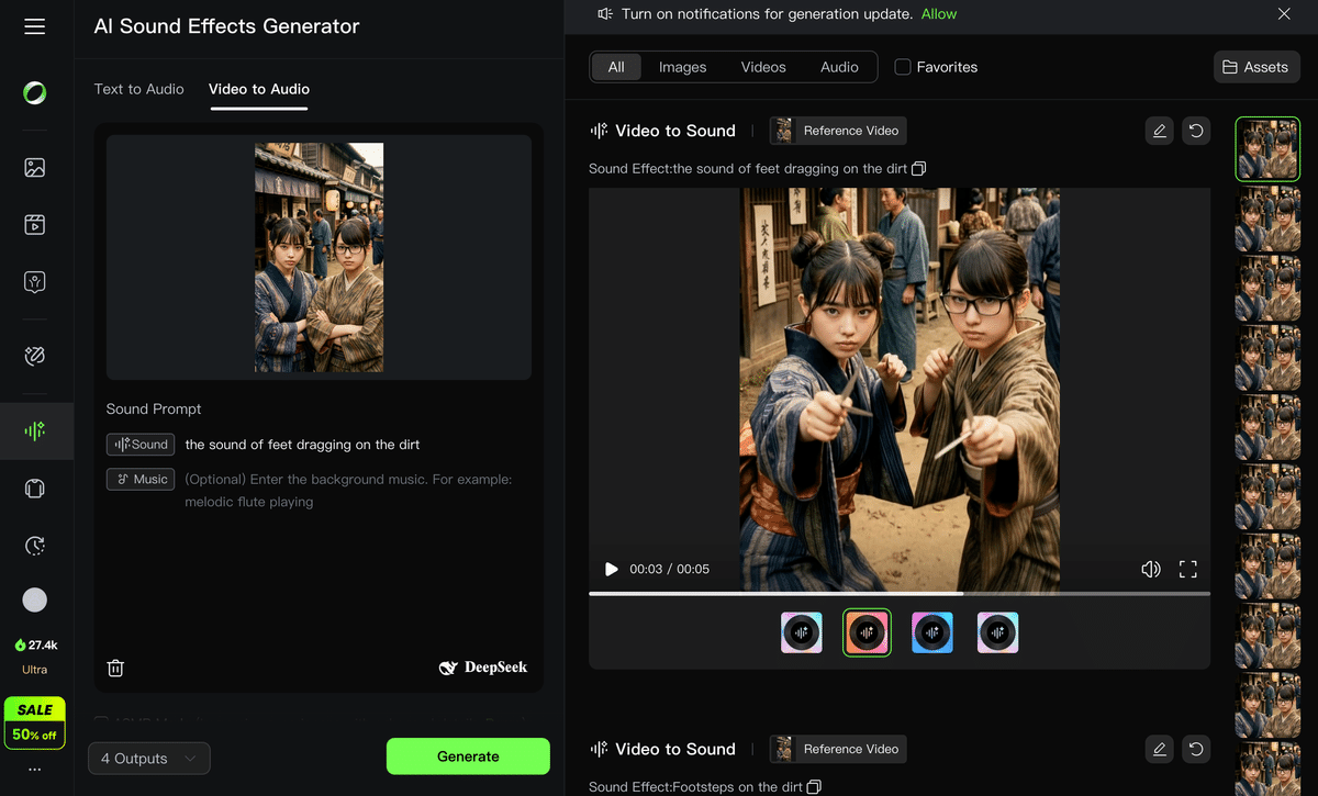 効果音もElevenLabsで生成しているが、KLINGの動画生成で「動きと同期させたい」足音や爆発音などはKLINGの機能(AI Sound Effects Generator)で効果音を生成している。