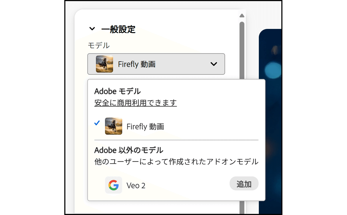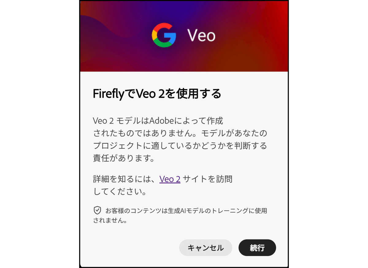 Adobeの生成AIモデルではないことを確認します。つまり、モデルの透明性や安全性に関しては保証されず、自己責任で使用することになります。